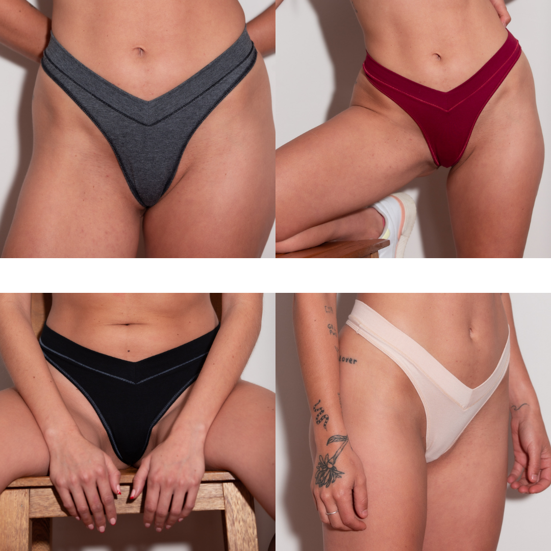 4 pantys tipo tanga color vino, gris, negro y crema.